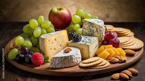 A beautifully arranged cheese platter featuring a variety of cheeses, fruits, nuts, and crackers