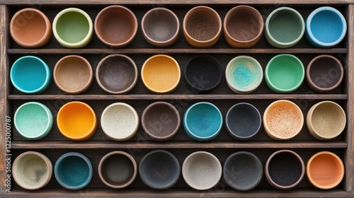 A beautifully arranged collection of ceramic bowls in various colors and textures on a wooden shelf