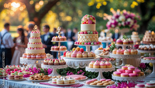 A beautifully arranged dessert table presents an assortment of cakes and sweets at an outdoor wedding reception.