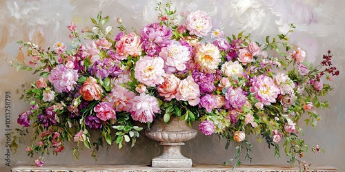 A beautifully arranged floral centerpiece featuring an array of pink and purple blooms in an elegant vase against a soft background.