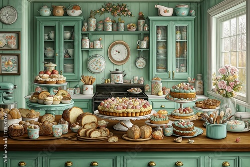 A beautifully arranged kitchen showcases a variety of baked delights, including an exquisite Easter cake amid a delightful spring atmosphere.