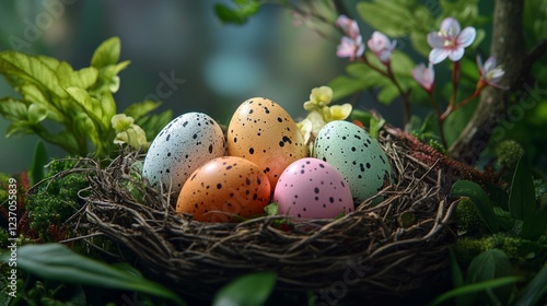 A beautifully arranged nest featuring colorful speckled eggs, surrounded by lush greenery and delicate flowers, evokes a sense of springtime and renewal.