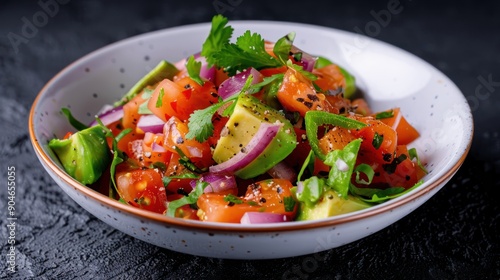 A beautifully arranged plate of guacamole and salsa, presented as a work of culinary art
