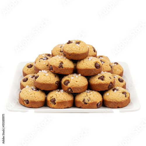 A beautifully arranged platter of chocolate chip cookies on a white background