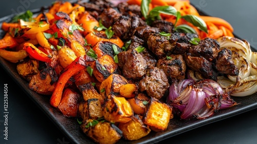 A beautifully arranged platter of colorful roasted vegetables, including peppers, carrots, and onions.