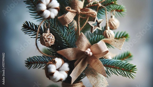 A beautifully arranged rustic Christmas decoration featuring pine branches, cotton, and handmade ornaments, creating a cozy festive ambiance. Perfect for adding warmth and charm to your holiday decor.