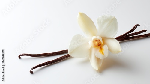 A beautifully arranged vanilla orchid flower alongside its pods on a clean white background, showcasing the beauty and elegance of this aromatic plant.