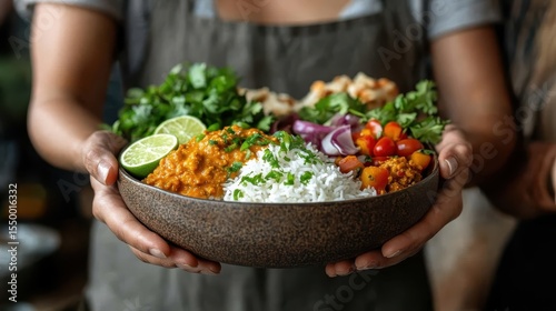 A beautifully arranged vegetarian bowl featuring rice, fragrant curry, fresh herbs, colorful vegetables, and lime, showcasing healthy and delicious eating options.