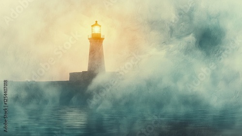 A beautifully atmospheric watercolor artwork of a lighthouse, its golden light shining through a dreamy blue-gray mist.