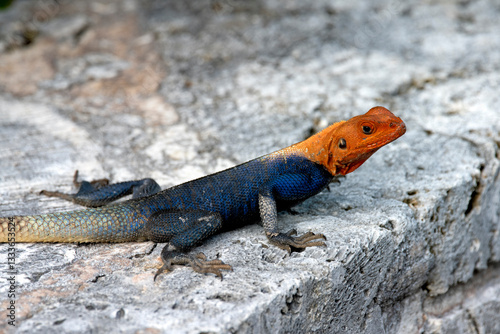 A beautifully colored lizard sunbathes on a rocky surface, showcasing its vibrant orange and blue hues, a stunning example of nature's artistry and animal adaptation.