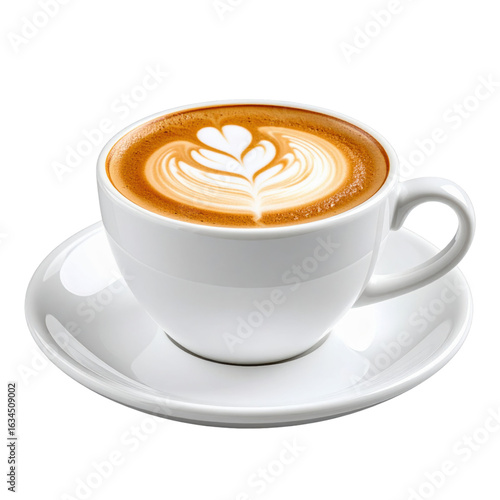 A beautifully crafted coffee cup with latte art showcasing a heart design, resting on a white saucer.