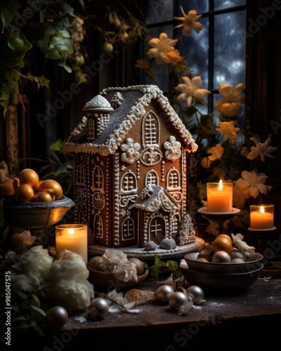 A beautifully crafted gingerbread house adorned with intricate icing, surrounded by candles and floral decor, creating a warm, festive atmosphere, Ideal for holiday-themed content, baking blogs