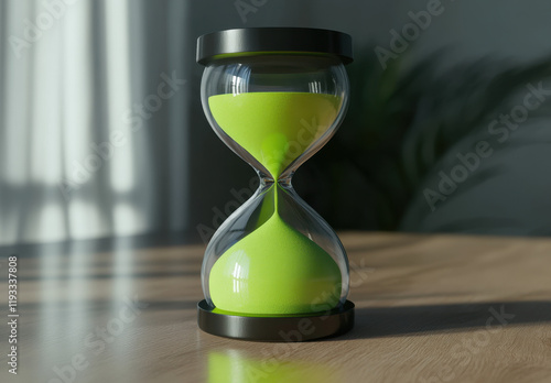 A beautifully crafted hourglass filled with bright green sand sits on a wooden table. Natural light streams in, creating a serene atmosphere perfect for reflection or study.