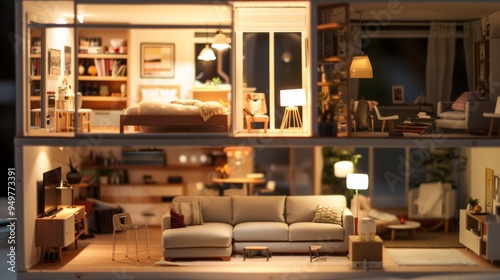 A beautifully crafted miniature model of a contemporary home interior, showcasing detailed rooms and elegant decor under soft lighting.