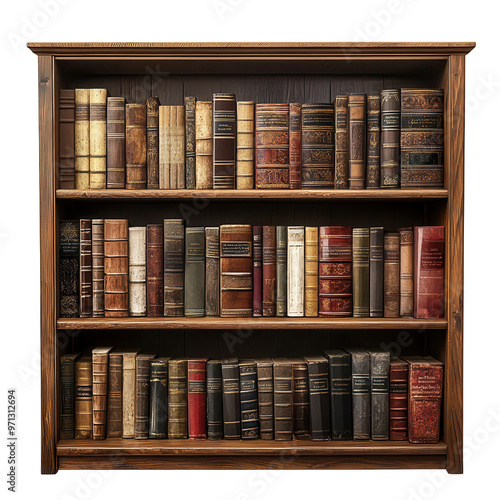 A beautifully crafted wooden bookshelf filled with an array of classic leather-bound books showcasing rich textures. isolated on a white background, transparent background.