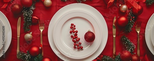 A beautifully decorated Christmas dinner table with festive ornaments and a black plate. Free copy space for text.