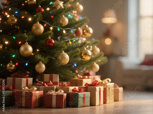 A beautifully decorated Christmas tree, adorned with colorful lights and golden and red baubles, stands over a pile of neatly wrapped festive gifts.