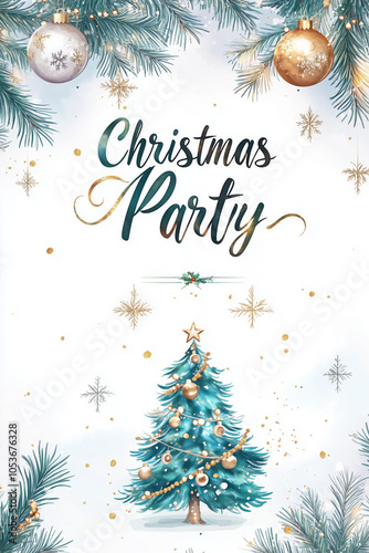 A beautifully decorated Christmas tree stands tall, embellished with gold ornaments and sparkling lights, radiating a warm holiday spirit. Snowflakes and golden stars create a joyful atmosphere.