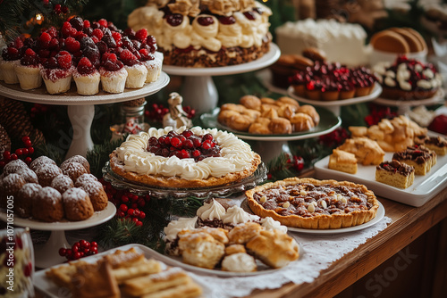 A beautifully decorated holiday table filled with an array of scrumptious desserts and seasonal treats for festive celebrations