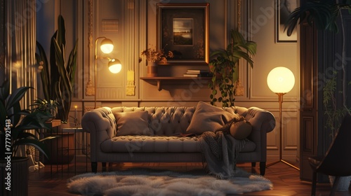 A beautifully decorated living room with a plush grey sofa, stylish armchair, and ambient glowing lamps, exuding a sense of coziness and tranquility perfect for unwinding after a long day