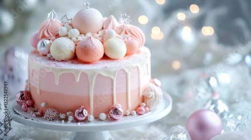 A beautifully decorated pink cake with white drips and intricate toppings, making it ideal for celebrations and special occasions.