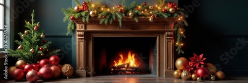 A beautifully decorated wooden mantle stands against a dark backdrop, showcasing an abundance of ornaments and garlands, Wooden Mantel, Wooden Wall