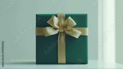 A beautifully designed green gift box with a neatly tied gold ribbon and bow, showcased on a white surface.
