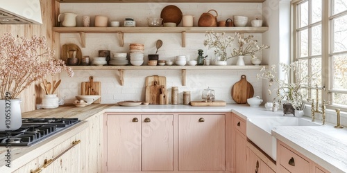 A beautifully designed kitchen featuring open shelves and pink cabinets