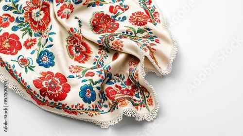 A beautifully embroidered fabric with floral patterns and lace trim.