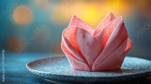 A beautifully folded pink napkin resembling a lotus flower on a decorative plate.