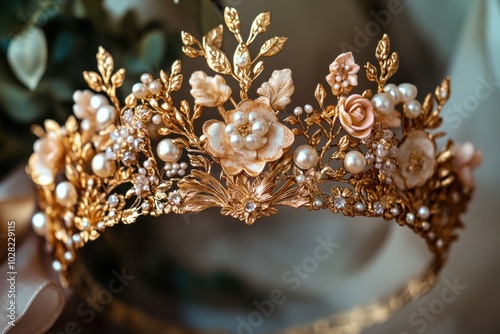 A beautifully handcrafted golden crown adorned with flowers and pearls, perfect for a royal-inspired wedding ceremony