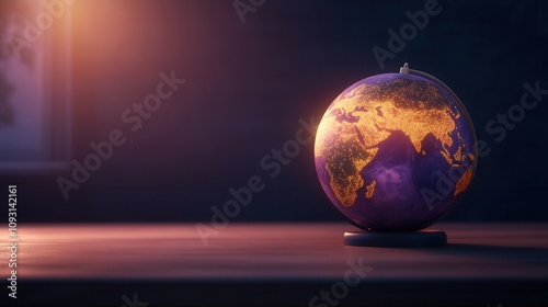 A beautifully illuminated globe showcasing Earth's continents, set against a dimly lit background, creating a warm and inviting atmosphere.