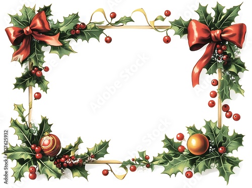 A beautifully illustrated Christmas frame adorned with vibrant red bows, holly leaves, and berries.