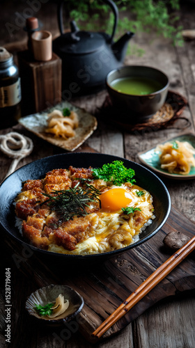 A beautifully plated Japanese katsudon in a matte black bowl, served over steamed rice with crispy golden pork cutlet, soft-cooked egg, and sweet soy-onion sauce