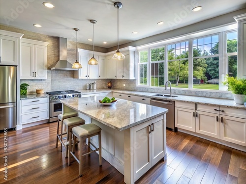 A beautifully renovated modern kitchen with sleek white cabinets, granite countertops, and stainless steel appliances,