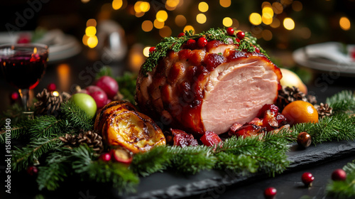 A beautifully set Christmas dinner table with roasted beef, vegetables, and a delicious chocolate cake