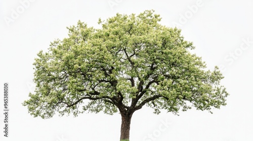 A beautifully shaped oak tree in spring, with fresh, light green leaves against a pure white backdrop.