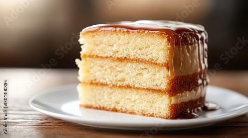 A beautifully sliced three-layer vanilla cake drizzled with a rich caramel sauce, creating an inviting and delicious dessert for any festive occasion.