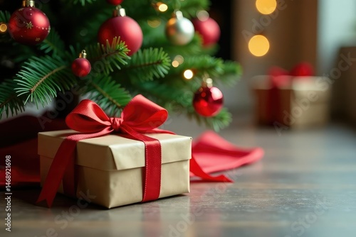 A beautifully wrapped Christmas gift sits beneath a decorated Christmas tree, surrounded by festive ornaments , decor, silver, christmas spirit