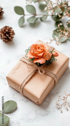 A beautifully wrapped gift box adorned with an orange rose, twine, and surrounded by pinecones and greenery.