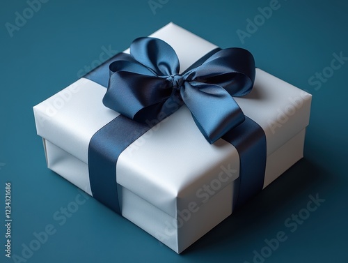 A beautifully wrapped gift box with a blue ribbon on a teal background.