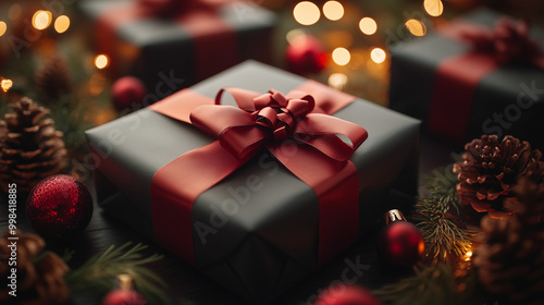 A beautifully wrapped gift box with a red ribbon sits among pine cones and festive lights, creating a warm, holiday atmosphere.