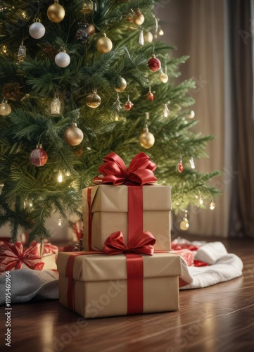 A beautifully wrapped gift sitting beneath a tall Christmas tree, colorful ribbon, decorated base, elegant design