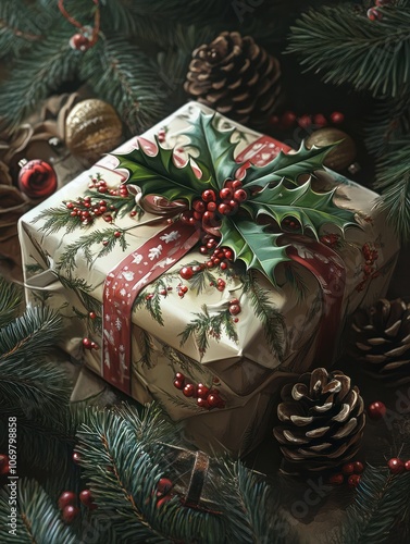 A beautifully wrapped gift with holly, surrounded by festive decorations and pine cones, evoking a cozy holiday atmosphere.