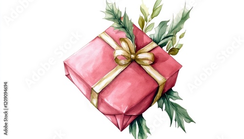 A beautifully wrapped pink gift box adorned with a golden ribbon and green foliage, perfect for festive celebrations