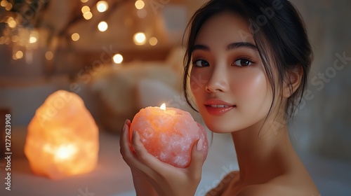 A beauty advertisement featuring an Asian model in a spa-inspired setting, applying night cream with delicate upward strokes, a glowing Himalayan salt lamp in the background,