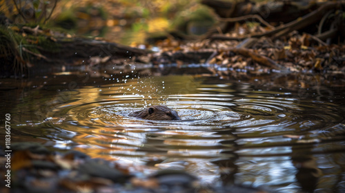 A beaver constructing a dam in a quiet woodland stream, with water ripples creating soft highlights