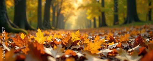 A bed of golden oak leaves on the forest floor, nature, earthy tones