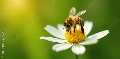 A bee collecting nectar from a single white flower, flowers, honey, pollen