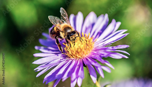 A bee pollinating a vibrant purple flower in a lush green setting.